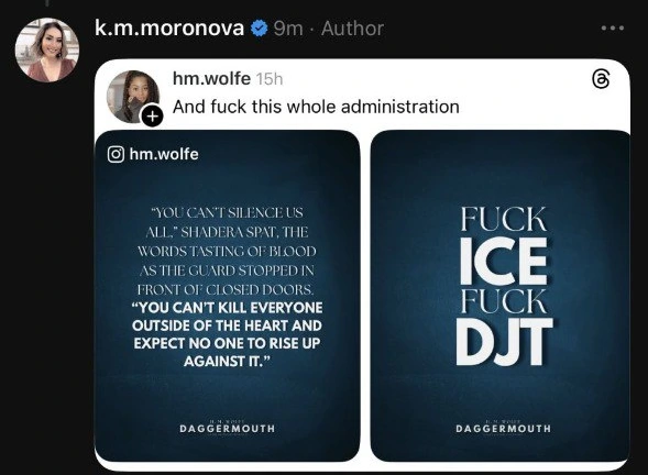 La polémica entre K. M. Moronova y la autora indie H. M. Wolfe ha seguido escalando en redes tras días de cruces públicos, capturas y reacciones de la comunidad lectora. El conflicto comenzó cuando Moronova acusó a Wolfe de «usar ICE (Immigration and Customs Enforcement, la agencia federal de Estados Unidos