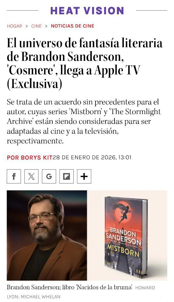 El propio Sanderson siempre ha dejado claro que no concibe una adaptación sin una implicación real en el proceso por eso se implicará como consultor en sus adaptaciones, además de guionista y productor, teniendo la última palabra. Por esa parte muchos de los fans respiran tranquilos. ¿Algun/a fan del Cosmere por aquí esperando con ansia viva que lleguen estas adaptaciones?