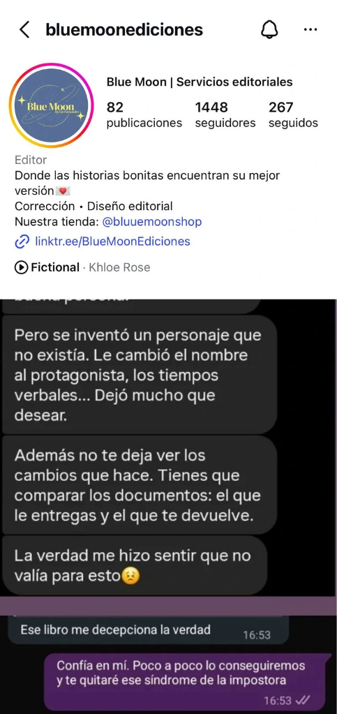 La bomba estalló la semana pasada cuando aparece en Instagram un perfil sospechosamente parecido ofreciendo los mismos servicios editoriales que en un principio ofrece BlueMoon, su fundadora decidió lanzar un post en su cuenta de Instagram con varios objetivos: avisar a la comunidad de escritores de las malas artes con el uso de la IA en su trabajo, la copia de sus servicios e incluso de la paleta de colores y finalmente desmentir cualquier vinculación de sus serviciosque ofrece @nightbloom_ediciones. Os dejamos una comparativa de los perfiles para que juzguéis vosotros mismos.