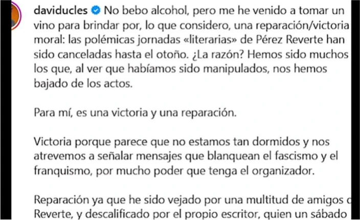 El evento organizado por Pérez-Reverte y Vigorra titulado “1936: La guerra que todos perdimos” ha tenido que ser aplazado debido a que David Uclés declinó su asistencia al evento porque iba a compartir mesa con políticos como José María Aznar (expresidente del Gobierno de España) e Iván Espinosa de los Monteros.