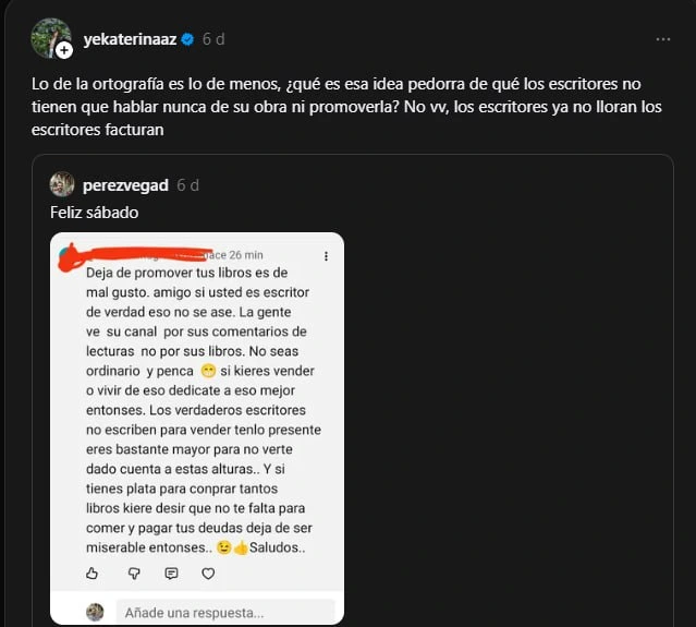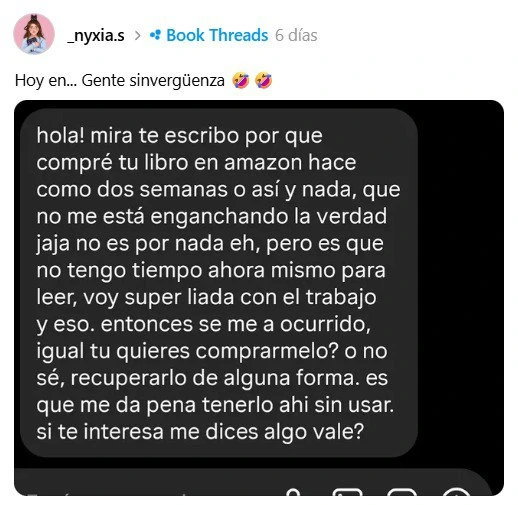 La autora Nyxia ha compartido en BookThreads el mensaje surrealista de una lectora que, tras comprar su libro en Amazon y admitir que «no le está enganchando y que no tiene tiempo para leerlo», le propone que sea la propia autora quien se lo recompre o le ayude a recuperar el dinero. La captura se ha viralizado rápidamente, provocando incredulidad y críticas entre otros autores y lectores,