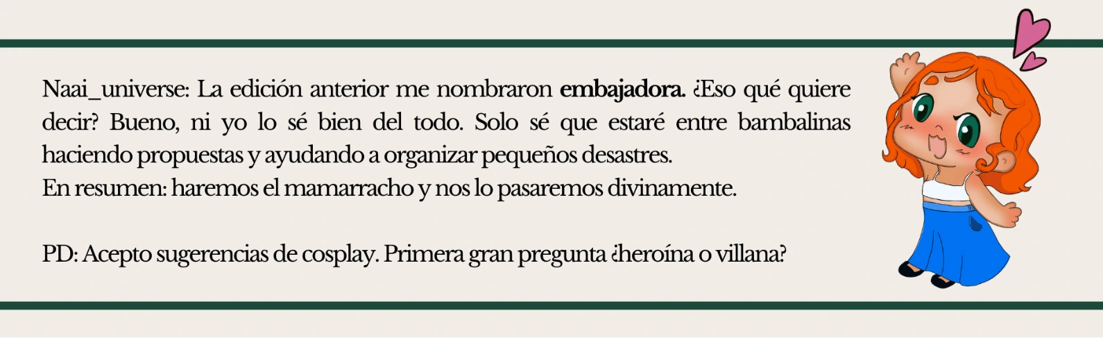 Nunca esperé serlo, pero necesitaba transmitir mis ideas. Mi primera opción iba a ser mi propia historia, pero le tenía miedo y la veía muy compleja; por eso, al llegar esta historia, vi la oportunidad de comenzar y aprender de mis errores.