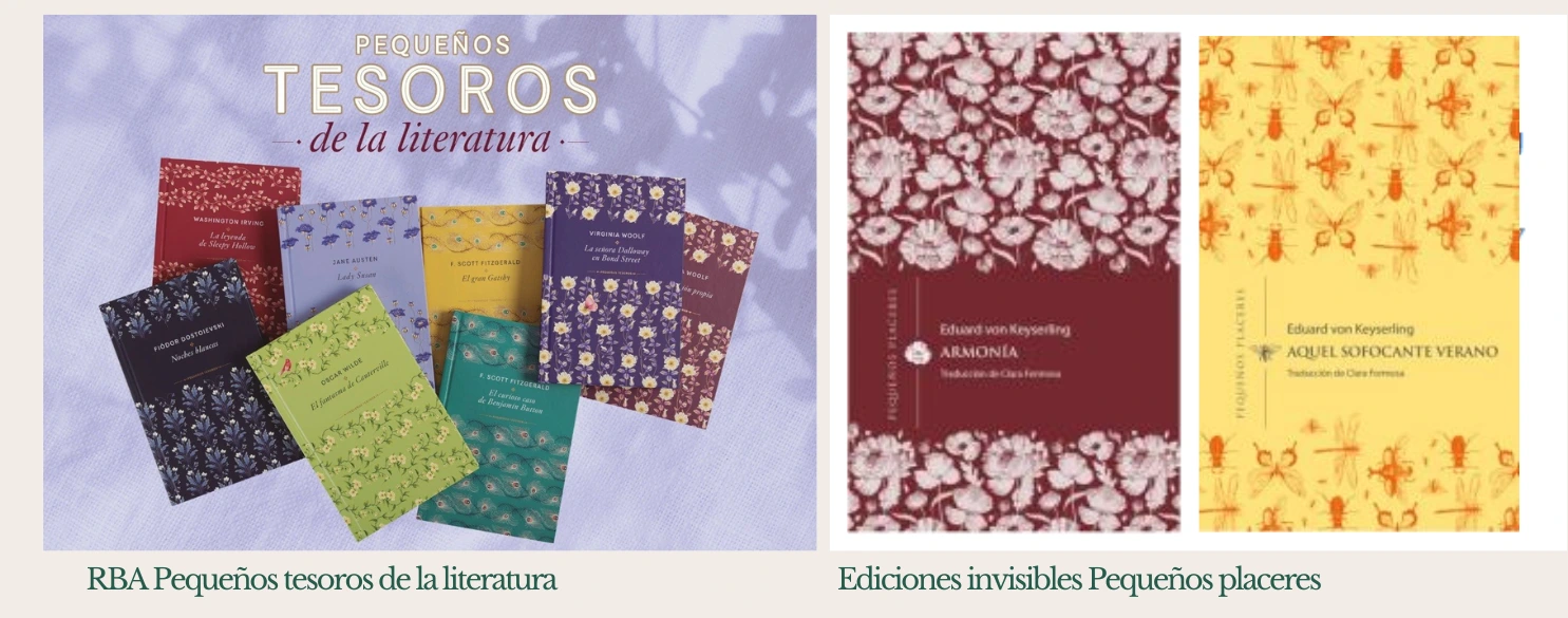 Las comparaciones entre la nueva colección de RBA y Pequeños Placeres señalan similitudes claras en el uso de patrones ornamentales, tipografías clásicas, colores suaves y la concepción del libro como objeto estético. Sin embargo, este tipo de diseño (inspirado en lo vintage, lo textil y lo decorativo) no es exclusivo de una sola editorial y lleva años presente en el mercado internacional.