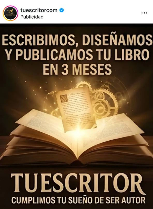 El 22 de enero a traves de la Instagram llegaba a varios usuarios este “anuncio” a través del perfil de @tuescritorcom donde. según aparece en la imagen, nos prometen escribir, diseñar, maquetar, corregir y publicar “nuestro libro” en tres meses, cumpliendo de esta manera nuestro sueño de ser autores con un curso o contratando sus servicios, valorados en 3500€.