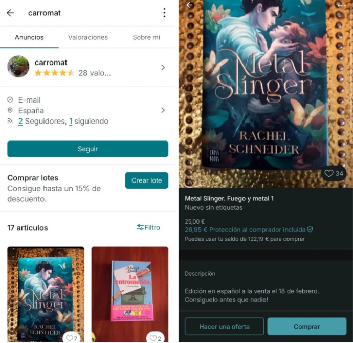 En una plataforma de compraventa de segunda mano ha aparecido recientemente un anuncio en el que se ofrece Metal Slinger, de Rachel Schneider, pese a que la edición en español todavía no ha salido a la venta oficialmente. En las imágenes del anuncio se aprecia con claridad el logo de Cross Books, la editorial española que publica el título, y el