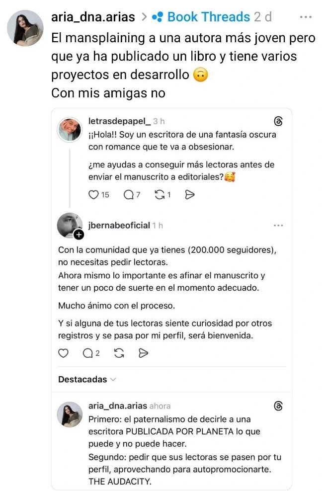La autora, y amiga de @letrasdepapel, @aria_dna.arias señaló que ese es precisamente el problema del mansplaining: que suele disfrazarse de buena intención mientras parte de una posición de superioridad y cuestiona implícitamente la legitimidad o experiencia de la otra persona. A raíz de esto, numerosas escritoras compartieron experiencias similares, denunciando un patrón recurrente de «consejos» dirigidos casi exclusivamente a mujeres.